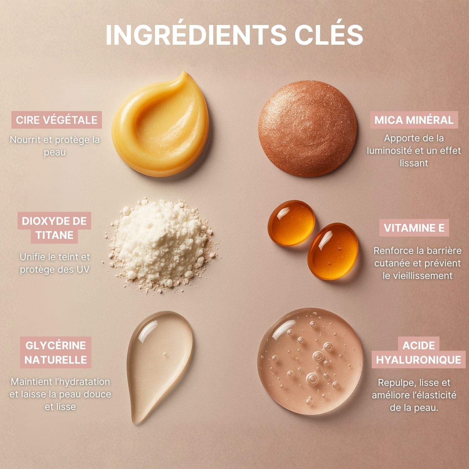 – Dioxyde de titane : contribue à une protection solaire naturelle et unifie le teint.